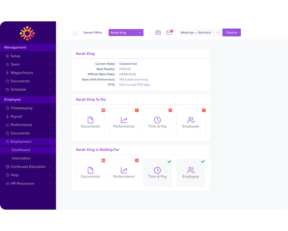 Our document dashboard shows you payroll, time clock, employee performance, and hiring and termination. All in one place. With built-in status updates so you know what’s done and who needs a nudge. Take a deep breath and feel the zen.