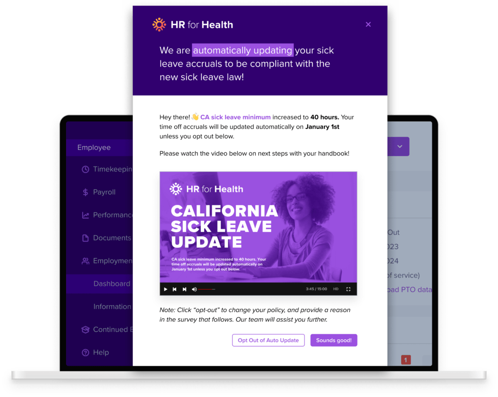 You and your employees are… human. Some days we forget to clock in. Some days we forget to clock out. Fridays we forget everything because it’s the friggin’ weekend baby. HR for Health lets you set simple alerts in your employee portal so you won’t forget again. Because humans are just human. But HR for Health makes you a cyborg.